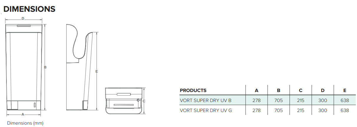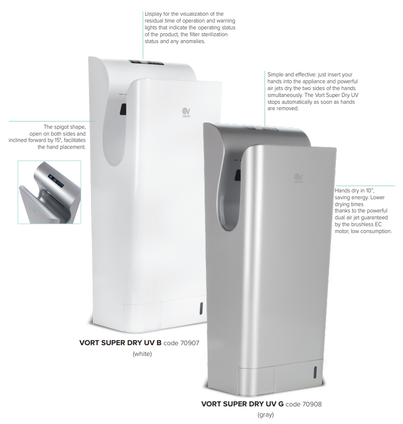 Plne automatický vysokovýkonný tryskový sušič rúk Vortice Vort Super Dry UV B je navrhnutý špeciálne pre frekventovanú prevádzku. Obsahuje výkonný radiálny ventilátor pre rýchle sušenie.