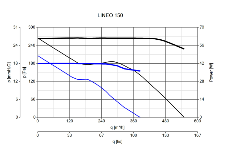 Dvojotáčkový potrubný ventilátor radu Lineo je vybavený AC motorom s 2-stupňovou reguláciou otáčok a guľôčkovými ložiskami. Typ T s časovým dobehom. Určený na pripojenie potrubia ø 150mm. Vďaka svojim vlastnostiam a konštrukcii je vhodný pre dlhšie vzduchotechnické potrubie. Krytie IP44 zaisťuje ochranu proti prachu a striekajúcej vode zo všetkých strán. Obežné koleso ventilátora je vyvážené priamo na motore.