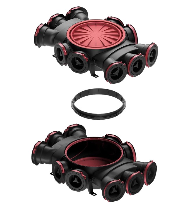 Vertikálna spojka sa používa na spojenie dvoch alebo viacerých rozdeľovacích boxov na seba. Dopojením ďalšieho rozdeľovacieho boxu sa zvýši počet pripojovacích hrdiel pre 75/90 mm potrubia o 10.