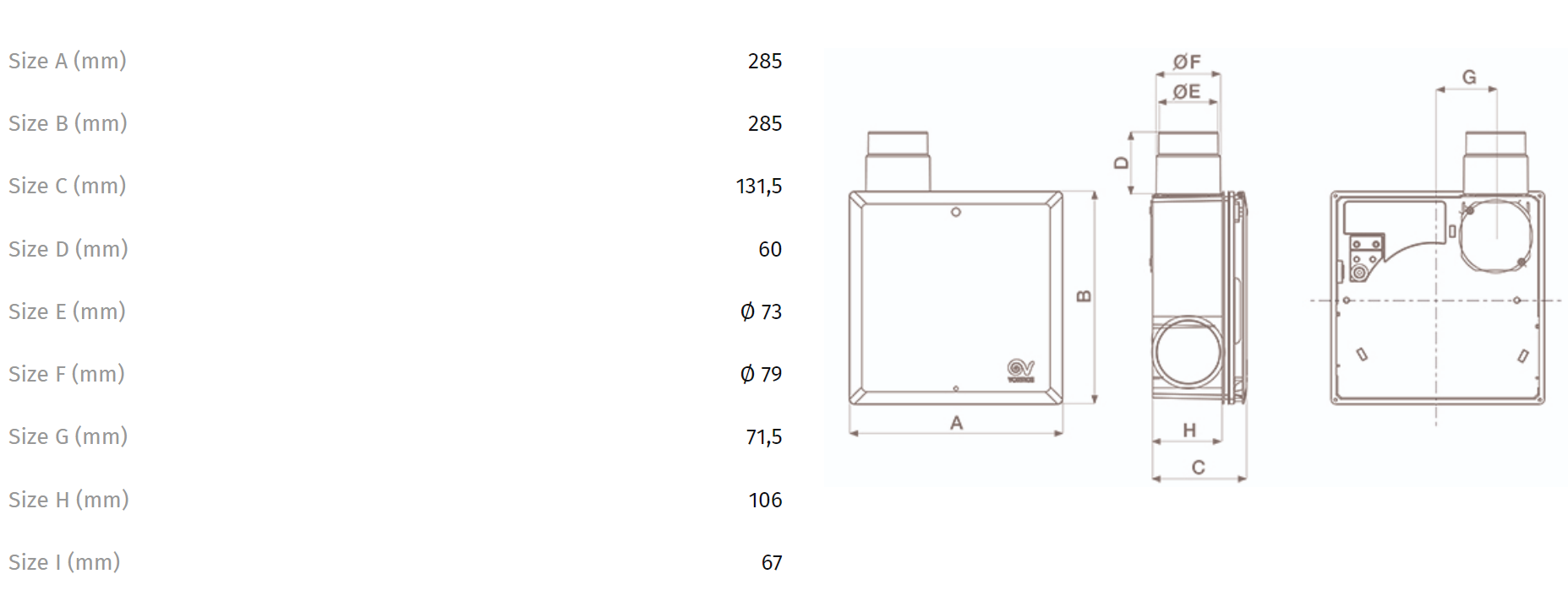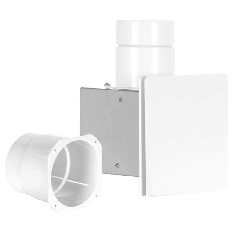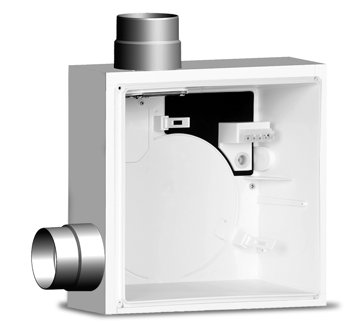 Krabica pre zapustenú montáž s požiarnou úpravou K90, s požiarnou spätnou klapkou K90 a bočným výfukom. Obsahuje doplnkové nerezové hrdlo na ľavej strane pre odsávanie z druhej miestnosti.