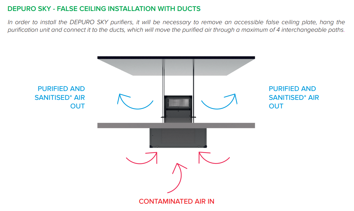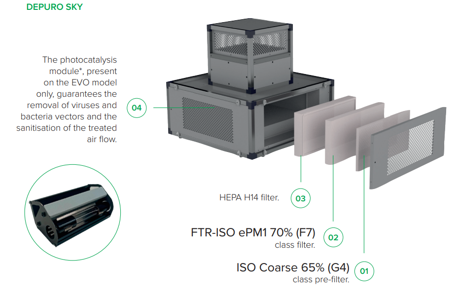 Vysokoúčinné čističe vzduchu Vortice Depuro Sky sú určené pre skrytú inštaláciu do stropu (podhľadu) v komerčných a priemyselných objektoch s plochou až 330 m2. Sú vysoko výkonné, jednoduché na inštaláciu a údržbu a tiché vďaka zvukotesným panelom. Vďaka komplexnému filtračnému systému dokážu rýchlo odstrániť koncentrácie znečisťujúcich látok, alergénov a patogénov prítomných vo vzduchu, čím zabezpečujú bezpečnosť a pohodlie obyvateľov.